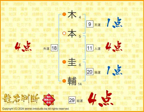 あなたの人生を表す1番重要な運勢です。生涯を通じて影響する総合運となり、主に50歳以降の晩年期に影響を及ぼします。苗字と名前の合計画数。