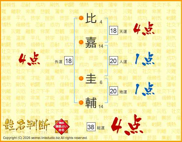比(4画)嘉(14画) 圭(6画)輔(14画)