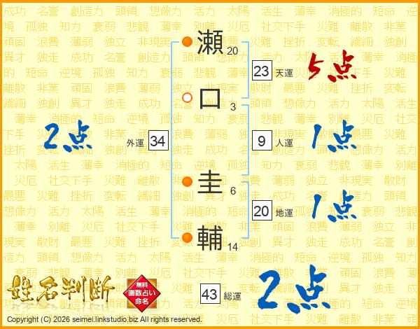 瀬(20画)口(3画) 圭(6画)輔(14画)