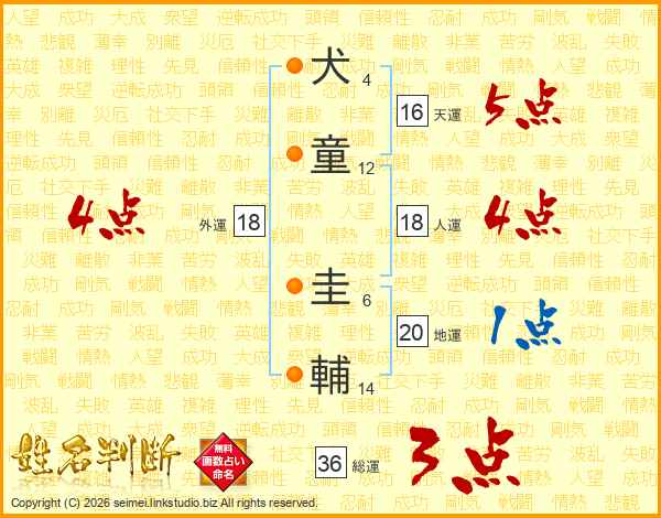 犬(4画)童(12画) 圭(6画)輔(14画)