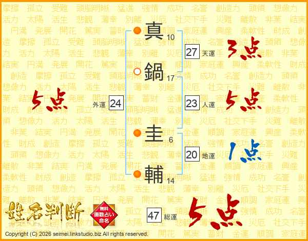 真(10画)鍋(17画) 圭(6画)輔(14画)