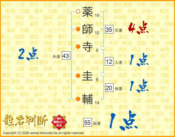 薬(19画)師(10画)寺(6画) 圭(6画)輔(14画)