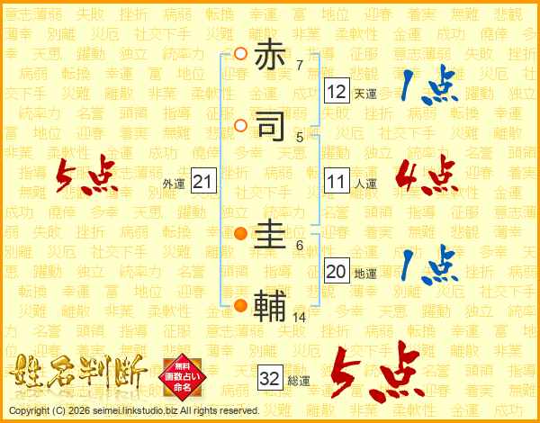 赤(7画)司(5画) 圭(6画)輔(14画)