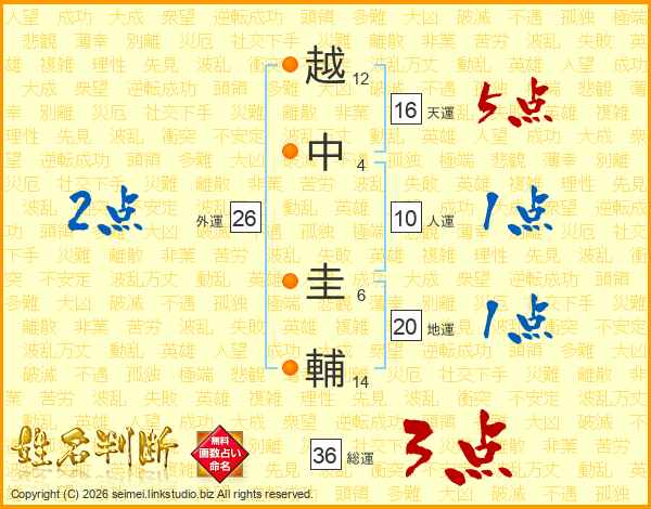 越(12画)中(4画) 圭(6画)輔(14画)
