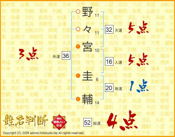 野(11画)々(11画)宮(10画) 圭(6画)輔(14画)