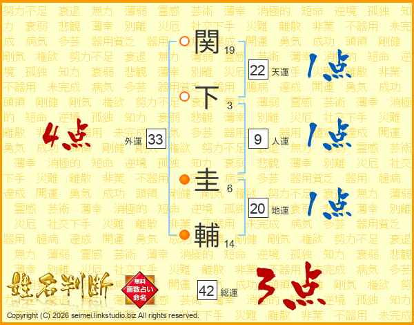 生活面を象徴する運勢です。外部から受ける影響力を表し、結婚運、家庭運や職場、環境への順応性を表します。総運から人運を引いた画数。姓や名が1文字の場合を除く。