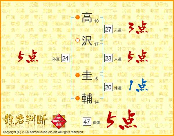 高(10画)沢(17画) 圭(6画)輔(14画)