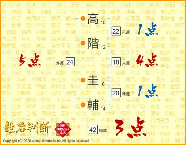 生活面を象徴する運勢です。外部から受ける影響力を表し、結婚運、家庭運や職場、環境への順応性を表します。総運から人運を引いた画数。姓や名が1文字の場合を除く。