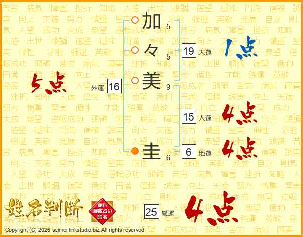 加(5画)々(5画)美(9画) 圭(6画)