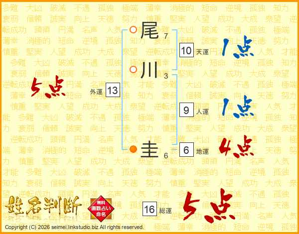 尾川圭さんの総運は16画の5点!