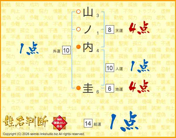山(3画)ノ(1画)内(4画) 圭(6画)