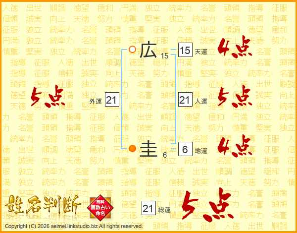 生活面を象徴する運勢です。外部から受ける影響力を表し、結婚運、家庭運や職場、環境への順応性を表します。総運から人運を引いた画数。姓や名が1文字の場合を除く。