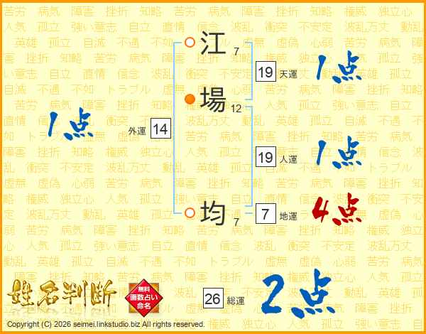 生活面を象徴する運勢です。外部から受ける影響力を表し、結婚運、家庭運や職場、環境への順応性を表します。総運から人運を引いた画数。姓や名が1文字の場合を除く。