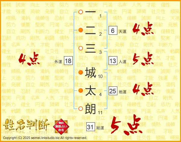 あなたの人生を表す1番重要な運勢です。生涯を通じて影響する総合運となり、主に50歳以降の晩年期に影響を及ぼします。苗字と名前の合計画数。