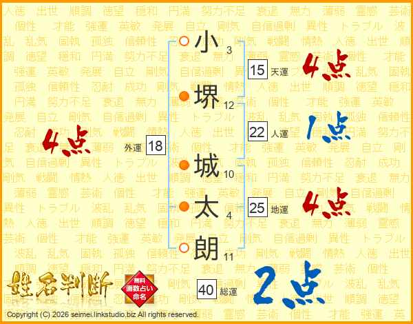 小(3画)堺(12画) 城(10画)太(4画)朗(11画)