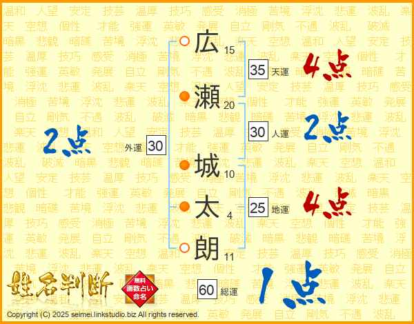 広(15画)瀬(20画) 城(10画)太(4画)朗(11画)
