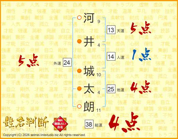 河(9画)井(4画) 城(10画)太(4画)朗(11画)
