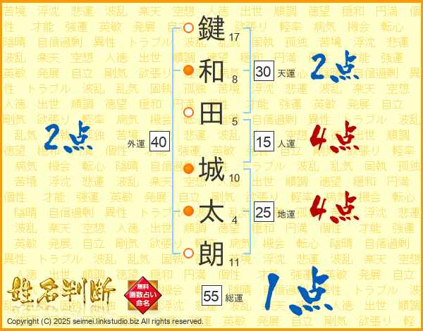 鍵(17画)和(8画)田(5画) 城(10画)太(4画)朗(11画)