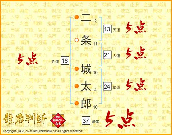 二(2画)条(11画) 城(10画)太(4画)郎(10画)