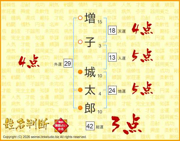 増(15画)子(3画) 城(10画)太(4画)郎(10画)