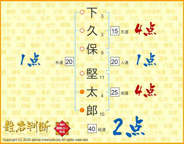 下(3画)久(3画)保(9画) 堅(11画)太(4画)郎(10画)