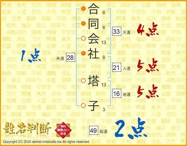 合(6画)同(6画)会(13画)社(8画) 塔(13画)子(3画)