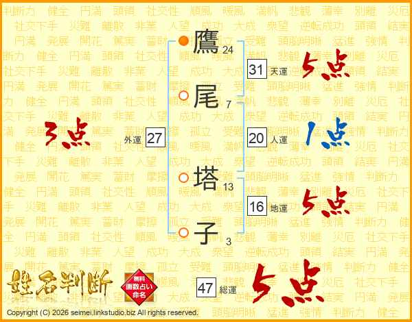 鷹(24画)尾(7画) 塔(13画)子(3画)
