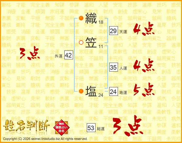 織笠塩さんの総運は53画の3点