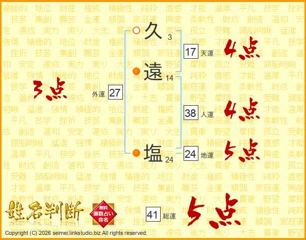 生活面を象徴する運勢です。外部から受ける影響力を表し、結婚運、家庭運や職場、環境への順応性を表します。総運から人運を引いた画数。姓や名が1文字の場合を除く。