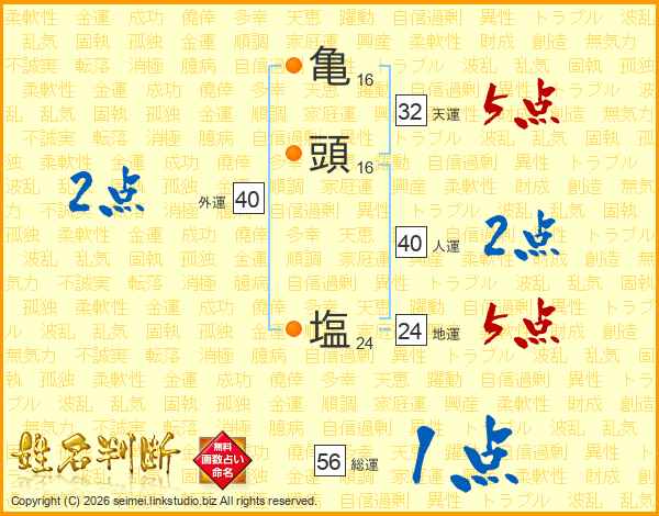 生活面を象徴する運勢です。外部から受ける影響力を表し、結婚運、家庭運や職場、環境への順応性を表します。総運から人運を引いた画数。姓や名が1文字の場合を除く。