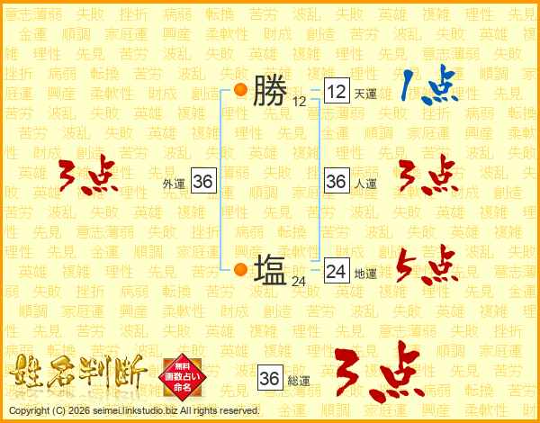 生活面を象徴する運勢です。外部から受ける影響力を表し、結婚運、家庭運や職場、環境への順応性を表します。総運から人運を引いた画数。姓や名が1文字の場合を除く。