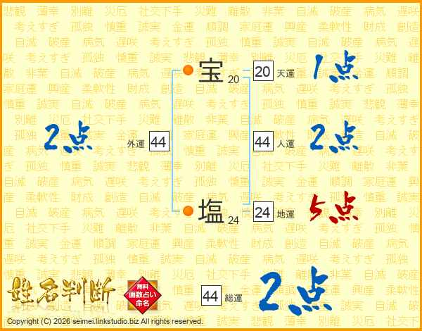 生活面を象徴する運勢です。外部から受ける影響力を表し、結婚運、家庭運や職場、環境への順応性を表します。総運から人運を引いた画数。姓や名が1文字の場合を除く。