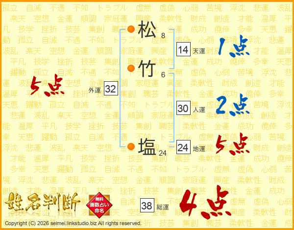 生活面を象徴する運勢です。外部から受ける影響力を表し、結婚運、家庭運や職場、環境への順応性を表します。総運から人運を引いた画数。姓や名が1文字の場合を除く。