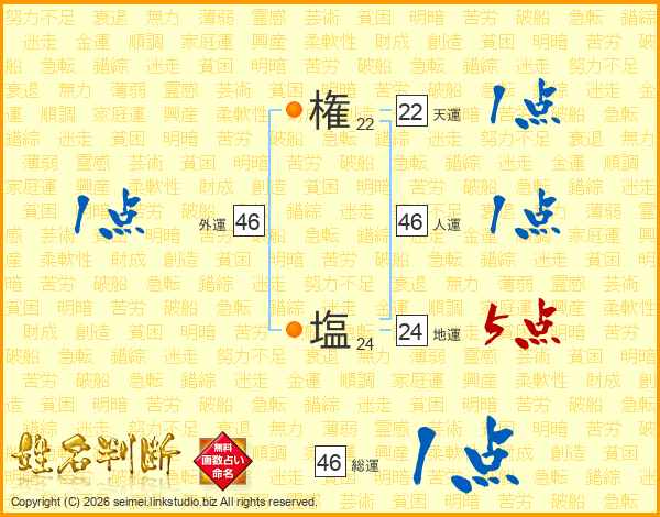 生活面を象徴する運勢です。外部から受ける影響力を表し、結婚運、家庭運や職場、環境への順応性を表します。総運から人運を引いた画数。姓や名が1文字の場合を除く。