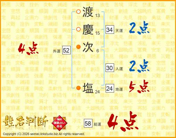 渡(13画)慶(15画)次(6画) 塩(24画)