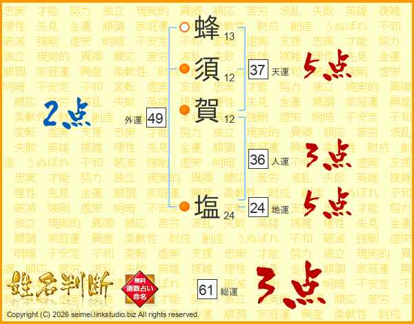 蜂須賀塩さんの天運は37画の5点!