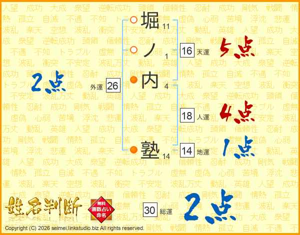 堀(11画)ノ(1画)内(4画) 塾(14画)