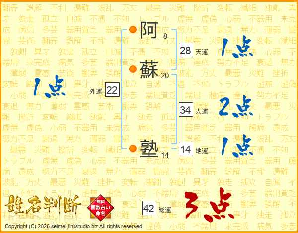 阿(8画)蘇(20画) 塾(14画)