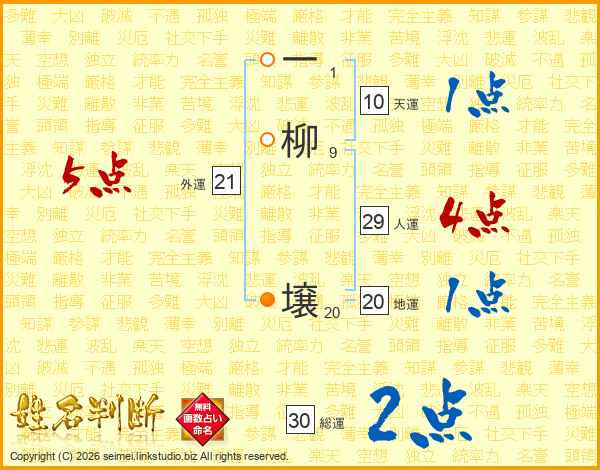 生活面を象徴する運勢です。外部から受ける影響力を表し、結婚運、家庭運や職場、環境への順応性を表します。総運から人運を引いた画数。姓や名が1文字の場合を除く。