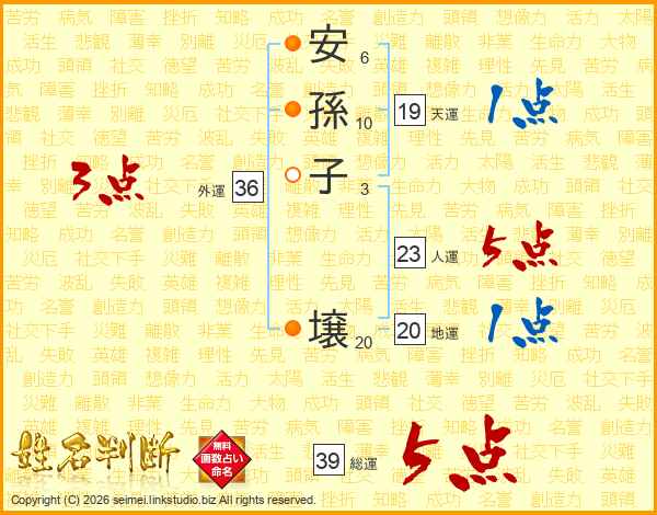 あなたの人生を表す1番重要な運勢です。生涯を通じて影響する総合運となり、主に50歳以降の晩年期に影響を及ぼします。苗字と名前の合計画数。