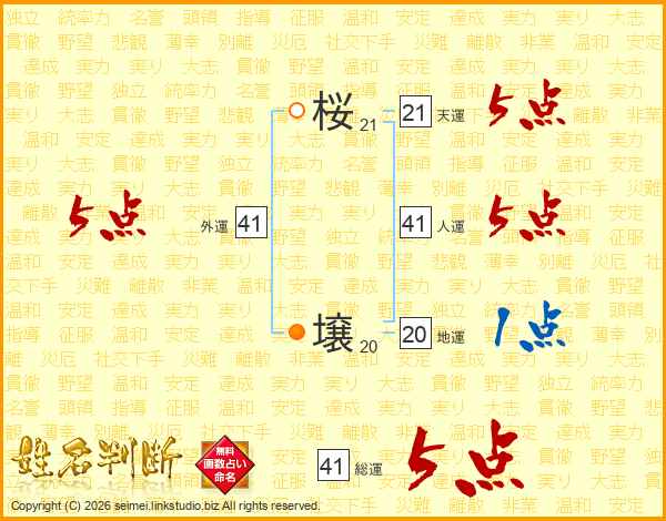 生活面を象徴する運勢です。外部から受ける影響力を表し、結婚運、家庭運や職場、環境への順応性を表します。総運から人運を引いた画数。姓や名が1文字の場合を除く。