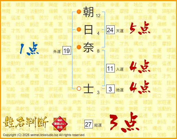 朝日奈士さんの総運は27画の3点!