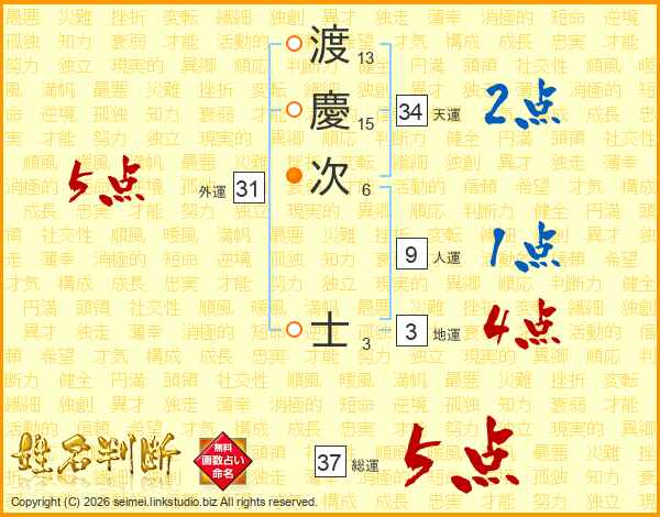 渡慶次士さんの総運は37画の5点!