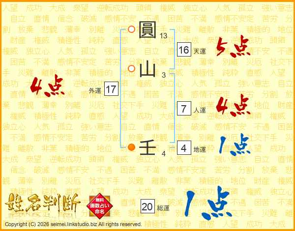 生活面を象徴する運勢です。外部から受ける影響力を表し、結婚運、家庭運や職場、環境への順応性を表します。総運から人運を引いた画数。姓や名が1文字の場合を除く。