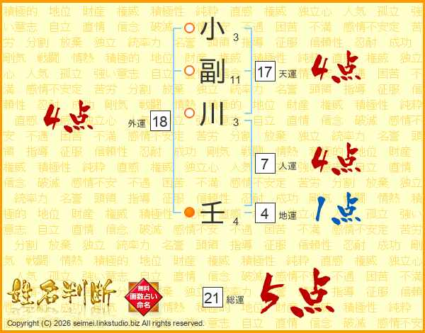 小副川壬さんの総運は21画の5点!