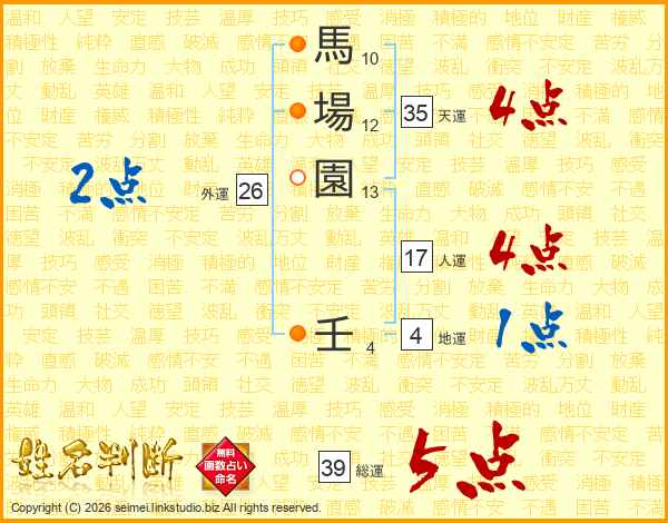 生活面を象徴する運勢です。外部から受ける影響力を表し、結婚運、家庭運や職場、環境への順応性を表します。総運から人運を引いた画数。姓や名が1文字の場合を除く。