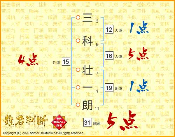 生活面を象徴する運勢です。外部から受ける影響力を表し、結婚運、家庭運や職場、環境への順応性を表します。総運から人運を引いた画数。姓や名が1文字の場合を除く。