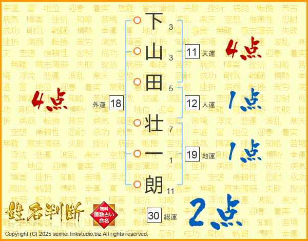 下(3画)山(3画)田(5画) 壮(7画)一(1画)朗(11画)