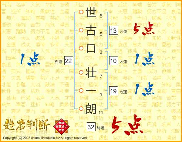 世(5画)古(5画)口(3画) 壮(7画)一(1画)朗(11画)