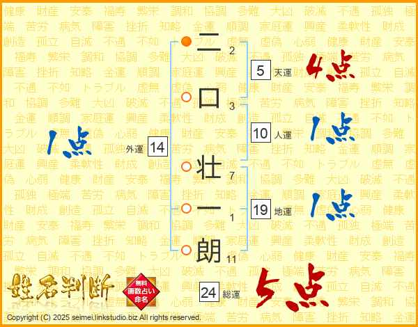 生活面を象徴する運勢です。外部から受ける影響力を表し、結婚運、家庭運や職場、環境への順応性を表します。総運から人運を引いた画数。姓や名が1文字の場合を除く。